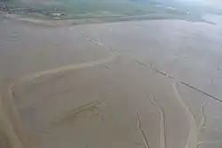Wurzel der Geise von Nordwesten: Links unten Emsfahrwasser, links oben Pogum, rechts oben Dykshusen, schräg im Bild Stabilisierunsgbuhne