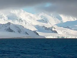 ![]() Blick von der Bransfieldstraße auf den Gela Point (links: Tarnowo-Piedmont-Gletscher; rechts: Chavei Cove mit Prespa-Gletscher) | ||