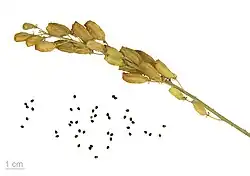 Die aufrechten Kapselfrüchte sind mit einer Länge von 8 bis 15 Millimetern länglich. Die Samen sind 1,6 bis 1,8 Millimeter lang, eiförmig, glatt, glänzend schwarzbraun mit gelblichem Nabelwulst.[2]