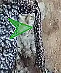 Die Tarsen sind alle fünfgliedrig. Die Krallen sind ungezähnt. Das erste Glied der Mitteltarsen ist etwa so lang wie das zweite, nicht viel länger. Der Zahn auf der Innenseite der Mittelschiene der Männchen ist nur sehr schwach in Form eines Winkels ausgebildet (Pfeilspitze in Abb. 4).[6][7]