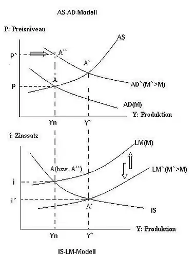 Mit der Hilfe des IS-LM-Modells und AS-AD-Modells zeigt die expansive Geldpolitik, wie sie sich auf die Wirtschaftssituation auswirkt. Es wird zuerst angenommen, dass alle Märkte sich im Gleichgewicht befinden. Dies ist Punkt A der Schnittstelle von der IS- und LM-Kurve in der Abbildung: Expansive Geldpolitik im AS-AD-Modell und IS-LM-Modell vor der Änderung der nominalen Geldmenge. D. h. die Produktion liegt auf ihrem natürlichen Niveau Yn und der Zinssatz ist gleich i. Dies entspricht auch dem Gleichgewichtspunkt A im AS-AD-Modell. Eine Ausdehnung der nominalen Geldmengen verursacht die Verschiebung der LM-Kurve nach unten. Im AS-AD-Modell verschiebt sich die aggregierte Nachfrage nach rechts, von AD nach AD’. Zu beachten ist nun die AD-Kurve aus der Gleichung: : Die Erhöhung der nominalen Geldmenge M lässt die reale Geldmenge M/P ansteigen. Dadurch ergibt sich ein neues Gleichgewicht im Punkt A’ in beiden Modellen. Der Endeffekt wäre die Zinssenkung auf dem Geldmarkt und dadurch entsprechende Anregung der Investition und Produktion auf dem Gütermarkt.[5]