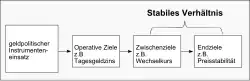 Operiert die Geldpolitik mit einem Zwischenziel, handelt es sich um eine zweistufige Strategie. Es wird sich zur Erreichung des Endziels auf eine weitere Variable – das Zwischenziel – konzentriert, welche eher kontrolliert werden kann. Die Zwischenziele befinden sich im geldpolitischen Prozess zwischen den direkt kontrollierbaren operativen Zielen und den gesamtwirtschaftlichen Endzielen (Abb. 1). Ein Zwischenziel sollte kurzfristig beobachtbar sein und durch die Zentralbanken mit ihrem zur Verfügung stehenden Instrumenteneinsatz kontrollierbar sein.