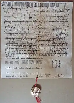 - ↑ Fritz Rössler: Übersetzungsversuch der Urkunde ( des vom 16. Januar 2014 im Internet Archive) Info: Der Archivlink wurde automatisch eingesetzt und noch nicht geprüft. Bitte prüfe Original- und Archivlink gemäß Anleitung und entferne dann diesen Hinweis.