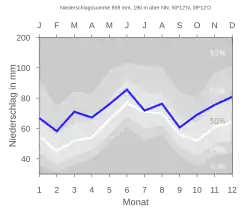 Der Jahresniederschlag beträgt 859 mm. Der Niederschlag liegt im oberen Viertel der Messstellen des Deutschen Wetterdienstes. 73 % zeigen niedrigere Werte an. Der trockenste Monat ist der Februar; am meisten regnet es im Juni. Im niederschlagreichsten Monat fällt etwa 1,5-mal mehr Regen als im trockensten Monat. Die jahreszeitlichen Niederschlagschwankungen liegen im unteren Drittel. In nur 3 % aller Orte schwankt der monatliche Niederschlag weniger.