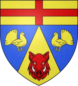 Blasonierung: Unter einem goldenen Schildhaupt mit einem durchgehenden roten gemeinen Kreuz in Blau mit zwei goldenen zugewendeten goldenen Tauben, die eine goldene Spitze mit einem roten zugewandten (en face gestellten) Eberkopf mit silbernen Augen und Hauern teilt.[2]