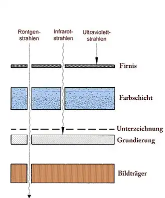 Die Grafik zeigt das Durchdringungsvermögen der UV-, Infrarot- und Röntgenstrahlen bei einem Gemälde.