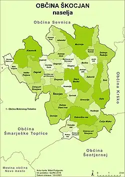 - ↑ Siedlungen in Škocjan (Jugovzhodna Slovenija / Dolenjska, Slowenien) - Einwohnerzahlen, Grafiken, Karte, Lage, Wetter und Web-Informationen. Abgerufen am 1. August 2023.