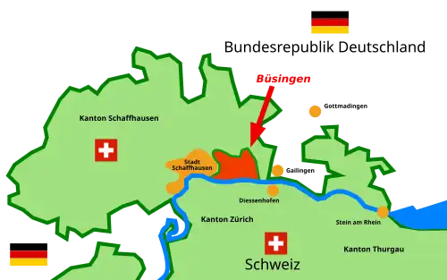 Büsingen am Hochrhein ist eine deutsche Gemeinde am rechten Ufer des Rheins im baden-württembergischen Landkreis Konstanz. Der Ort ist gänzlich vom Schweizer Staatsgebiet umgeben. Als Österreich 1770 seine Rechte an den Dörfern Ramsen und Dörflingen an das eidgenössische Zürich verkaufte, wurde Büsingen zu einer Enklave in der Schweizerischen Eidgenossenschaft und seitdem trennen 680 Meter Luftlinie Büsingen von seinem Mutterland Deutschland.
