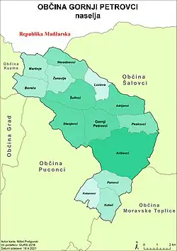 - ↑ Siedlungen in Gornji Petrovci (Pomurska, Slowenien) - Einwohnerzahlen, Grafiken, Karte, Lage, Wetter und Web-Informationen. Abgerufen am 31. Juli 2023.