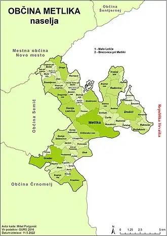 - ↑ Siedlungen in Metlika (Jugovzhodna Slovenija / Dolenjska, Slowenien) - Einwohnerzahlen, Grafiken, Karte, Lage, Wetter und Web-Informationen. Abgerufen am 1. August 2023.