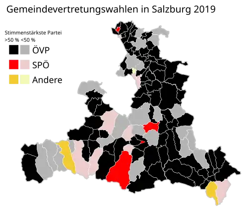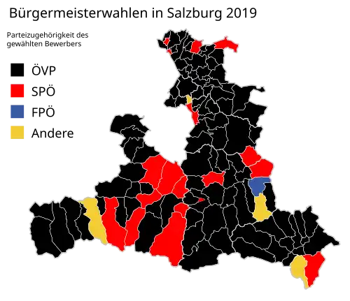 Im Ergebnis der Wahl wurden in 108 Gemeinden die Bürgermeister im ersten Wahlgang gewählt, d. h. erhielten mehr als 50 % der Stimmen. In 11 Gemeinden (Stadt Salzburg, Hallein, Seekirchen, Oberndorf, Zell am See, Elsbethen, Mattsee, Bad Hofgastein, Oberalm, St. Johann und Straßwalchen) erreichte kein Kandidat die absolute Mehrheit, so dass am 24. März 2019 eine Stichwahl stattfand.[4] In der Stadt Salzburg kam der ÖVP-Bürgermeisterkandidat im ersten Wahlgang mit 41,4 % auf den ersten Platz.[5]