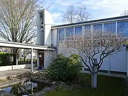 Der Eingang zum Kirchsaal befindet sich zwischen den zwei Wandscheiben des Glockenturms aus Sichtbeton. Sie reichen an einer Ecke des Kirchenschiffs bis in die Höhe seines Flachdachs. Auf ihnen steht eine offene Glockenstube aus trapezförmigen Wandscheiben, bedeckt mit einem Satteldach, ebenfalls aus Sichtbeton. Dort hängt eine Bronzeglocke, die 1961 von Petit & Gebr. Edelbrock gegossen wurde. Sie hat eine Höhe von 79 cm, einen Durchmesser von 98 cm und eine Krone von 15 cm. Ihr Schlagton ist gis′.