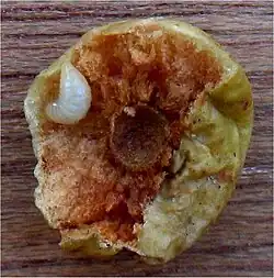 Querschnitt durch einen Gallapfel; Links oben die Larve der Eichengallwespe