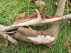 Der Gemeine Rindensprenger (Vuilleminia comedens) ist ein sehr häufiger Pilz aus der Familie der Prachtrindenpilzverwandten (Corticiaceae).