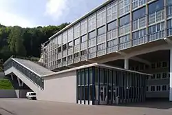 Drei unterschiedlich ausgestaltete Treppen mit prägnanter Formgebung ermöglichen den Zutritt zu den oberen Stockwerken. Ein vom Gebäude abgelöstes, gedecktes Treppenhaus führt den Hang hinauf, hebt sich aber durch zwei V-förmig gestellte Doppelstützen vom Terrain ab. Sechs Treppenläufe mit je elf Stufen werden durch Zwischenpodeste etappiert, der mittlere Handlauf ist mit einem Lichtband versehen. In der Mitte der Vorhalle windet sich eine spiralförmige, frei stehende Wendeltreppe in zwei vollen Umdrehungen hinauf zu einem Einschnitt im Boden des vierten Stockwerks. Am hangseitigen Ende der Vorhalle führt eine Treppe im Zickzack hinauf zum Quertrakt.[2]