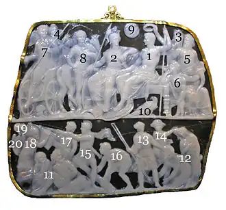 Im unteren Bildstreifen richten siegreiche römische Legionäre (Nr. 15 bis 18) ein Tropaion (Siegesdenkmal) auf, unterworfene „Barbaren“ (Nr. 11 und 12) beobachten die Szene. Der Halbedelstein wurde vermutlich nach 10 n. Chr. in der Werkstatt, die der Steinschneider Dioskurides in Rom gegründet hatte, bearbeitet. Die Gemma Augustea ist eines der Prunkstücke der Antikensammlung des Kunsthistorischen Museums in Wien (Inv.-Nr. AS IXa 79).