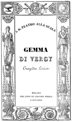 - ↑ Giovanni Emanuele Bidera & Gaetano Donizetti: Gemma di Vergy, Giacomo Pirola, Mailand 1834.