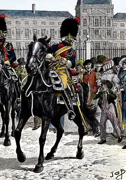 Die „Gendarmes d’élite“ am Tag der Geburt von Napoléon II auf Wache vor dem Palais des Tuileries. Illustration von Job.