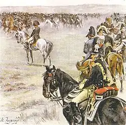 Schlacht bei Wagram. Im Vordergrund ein Gendarme d’élite in Bereitschaft.