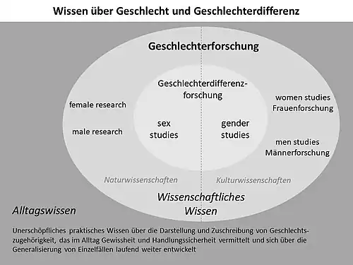 Bereits 1972 plädierte Rosemarie Nave-Herz für den Begriff Geschlechtersoziologie und wandte sich gegen die Reduzierung auf die Bezeichnung Frauenforschung.[10] Mit ihrem Aufsatz Gender: A Useful Category of Historical Analysis von 1986 trug Joan Wallach Scott dazu bei, dass Gender als kritische Analysekategorie zu einem zentralen Begriff in der Wissenschaftsforschung des 20. Jahrhunderts wurde.[11] Mit der Einführung der Kategorie Geschlecht in den wissenschaftlichen Diskurs wandelte sich die Frauenforschung zur Geschlechterforschung, die nun auch Männer umfasst. Sie untersucht interdisziplinär die zentrale Bedeutung von Geschlecht in Wissenschaft und Gesellschaft, da es kaum einen Bereich gibt, in dem Geschlecht keine Rolle spielt. Vorerst sollten die Unterschiede und Beziehungen von biologischem und soziokulturellem Geschlecht untersucht werden. Dabei wurde Geschlecht nicht primär als individuelle Eigenschaft betrachtet, sondern als soziales Verhältnis einer politisch und historisch gewachsenen Sozialstruktur. Das Geschlechterverhältnis stand also im Mittelpunkt.[12]