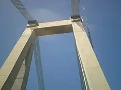 Innerhalb der Rahmen ist wiederum eine große V-förmige Struktur aus 2 × 2 breiten Stahlbetonstreben angeordnet, die von einer durch den Pylonrahmen weitgehend verdeckten A-Struktur überlagert wird. Sie wird deshalb auch als XX-Pfeiler bezeichnet. Dieser XX-Pfeiler trägt einen 44,39 m langen Pfeilertisch, der aus einem geschlossenen, dreizelligen Spannbeton-Hohlkasten mit einer Bauhöhe von 5 m besteht. Die Pfeilertische wurden in beide Richtungen durch 72,33 m lange Spannbeton-Kragarme verlängert, die auf Lehrgerüsten gebaut wurden, die von einem Schwimmkran eingehoben und an ihrem äußeren Ende durch Hilfspfeiler abgestützt wurden. An ihren äußeren Enden ist jeweils ein seitlich über den Rand hinausragender Seilquerträger eingebaut. Damit entstand ein Fahrbahnträger von 189,05 m Länge. Anschließend wurden je 16 vollverschlossene, 7,4 cm starke Schrägseile über die Kabelsattellager an den Pylonspitzen gezogen und in den Seilquerträgern verankert.