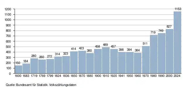 - ↑ Daten der Eidgenössischen Volkszählungen ab 1850 nach Gemeinden. (XLSX; 10 MB) Bundesamt für Statistik, Neuchâtel, 12. Juli 2024, abgerufen am 3. Februar 2025 (Öffnung in Excel nur über "Anhang/Excel-Datensatz" möglich).