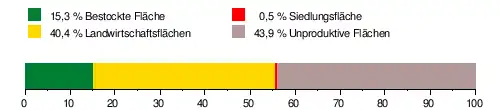 Es besteht zu 15,3 % aus bestockter Fläche, zu 40,4 % aus Landwirtschaftsfläche, zu 0,5 % aus Siedlungsfläche und zu 43,9 % aus unproduktiven Flächen.