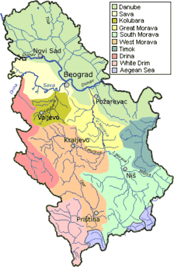 Die Flüsse Serbiens gehören drei Einzugsgebieten an, die jeweils dem Schwarzen Meer, der Adria und der Ägäis tributär sind. Dabei liegen über 90 % der Fließgewässer im Einzugsgebiet der Donau. Nur im Südosten entwässert die Pčinja zur Ägäis und im Südwesten der Beli Drim (Weißer Drim) zur Adria. Auf dem Gebirgszug der Crnoljeva befindet sich die hydrografische Grenze zwischen den Entwässerungsgebieten der Adria, Ägäis und Schwarzem Meer. Vom höchsten Punkt der Drmanska glava (1.367 m) verlaufen die Flüsse über den Weißen Drim in die Adria, über die Sitnica und Ibar ins Schwarze Meer und über die Zuflüsse des Lepenac zum Vardar und in die Ägäis. Durch eine hydrografische Besonderheit entwässert die Nerodimka im Einzugssystem der Sitnica im Kosovo durch eine Bifurkation sogar in zwei Meere.