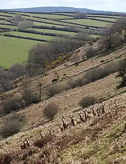 Das Exmoor ist ein Nationalpark, der zu 71 % in Somerset und zu 29 % in Devon liegt. Zum Gebiet des Nationalparks gehören die Brendon Hills und das Vale of Porlock. Er hat eine Fläche von 692,8 km2 offenen und hügeligen Moorlands, und der Park hat eine Küstenlinie von 55 km.[40]