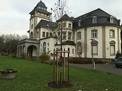 Der zweistöckige Rechteckbau mit Walmdach ist mehrfach gegliedert. Nach Nordosten zweigt ein Baukörper rechtwinklig ab, nach Nordwesten ist ein Vorbau zur Straßenansicht vorgesetzt, in den ein fünfstöckiger quadratischer Turm mit barocker, verschieferter Haube integriert ist, der als architektonische Besonderheit eine umlaufende Balustrade im vierten Stock besitzt. Nach Südwesten ist der Baukörper U-förmig abgerundet und hier von einem Krüppelwalmdach überdacht, das bogenförmig mit Dachgauben mit Dreiecksgiebeln durchsetzt ist. An der Westseite lehnt ein oktogonaler dreistöckiger Turm mit spitzer verschieferter Haube an das Hauptgebäude an. Die erhaltenen Elemente des Jugendstils im Innern sind architektonisch und künstlerisch hervorzuheben.