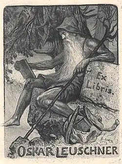 - ↑ Oskar Leuschner war ein aktives Mitglied der Deutschen Exlibris Gesellschaft, Buchhändler in Leipzig und Berlin. Bekannt war er unter anderem in Berlin als Verleger der Prähistorischen Blätter.