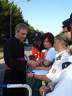Georg Gänswein (* 30. Juli 1956 in Riedern am Wald) ist ein deutscher römisch-katholischer Geistlicher, Diplomat des Heiligen Stuhles und Titularerzbischof. Kardinal Ratzinger, der spätere Papst Benedikt XVI., berief ihn 2003[1][2] zu seinem Privatsekretär. Gänswein blieb dies auch nach Benedikts Emeritierung 2013 bis zu dessen Tod am 31. Dezember 2022. Nach knapp einem Jahr ohne feste Aufgabe in seinem Heimatbistum Freiburg[3] wurde er am 24. Juni 2024 zum Apostolischen Nuntius in Litauen, Estland und Lettland ernannt.[4] Seit dem 6. September 2024 ist er in diesem Amt tätig.