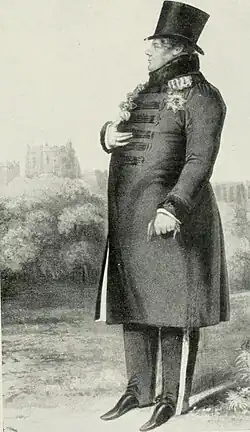 Georg IV. allerdings favorisierte mit zunehmendem Alter dunklere Farben, da diese seine Leibesfülle besser überspielten. Er bevorzugte außerdem die etwas loser sitzenden und damit für ihn vorteilhafteren langen Hosen gegenüber den bis dahin am Hofe üblichen Kniehosen.[106] Auch seine Bereitwilligkeit, den Halstuchmoden von Beau Brummel zu folgen, wird darauf zurückgeführt, dass diese ihm halfen, sein Doppelkinn zu verbergen.[106] Zu den modischen Neuerungen, die Georg IV. während seiner Kronprinzenzeit populär machte, zählt auch der Verzicht auf das Tragen gepuderter Perücken.[107]
