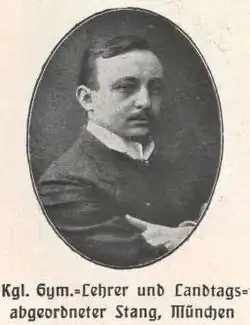 Stang, Sohn eines Konditormeisters, absolvierte 1898 das humanistische Gymnasium in Münnerstadt. Er studierte an der Universität Würzburg und wurde dort Mitglied des K.St.V. Normannia Würzburg, wo er sehr engagiert mitarbeitete. 1902 und 1903 legte er die Staatsprüfungen in Altphilologie und Geschichte ab. Es folgten Stellungen als Gymnasiallehrer in Amorbach, Hof, Würzburg und München. 1944 wurde er von den Nationalsozialisten zwangspensioniert. Im Jahre 1946 wurde er Oberstudiendirektor am Wilhelmsgymnasium in München.