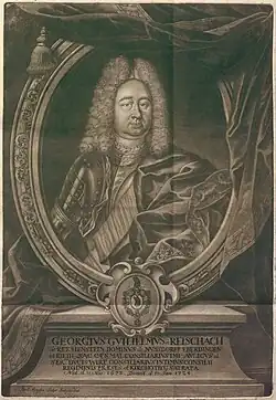Georg Wilhelm von Reischach war Erster Gesandter beim Schwäbischen Reichskreis[4] und zuletzt Obervogt zu Kirchheim/Teck. 1720 wurde er zum Kaiserlichen Wirklichen Reichshofrat ernannt.