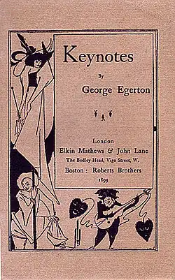 Egertons erstes Buch mit Kurzgeschichten, Keynotes, das zunächst William Heinemann ablehnte (deutsche Übersetzung erst 1991 als Schlüsselerlebnis, bis heute das einzige ihrer übersetzten Werke auf Deutsch), wurde von John Lane und Elkin Mathews bei Bodley Head 1893 veröffentlicht. Der Umschlagentwurf stammte bezeichnenderweise von Aubrey Beardsley.[7] Dieses Werk war so erfolgreich und gleichzeitig berüchtigt auf beiden Seiten des Atlantiks, dass Egerton bald von allen führenden Tageszeitungen und Magazinen interviewt sowie im Punch als Borgia Smudgiton, Autor der She-Notes, parodiert wurde. Egerton selbst fand sich überrascht, dass der Punch Einzelheiten ihres Erscheinungsbildes wie ihr kurzes Haupthaar und ihre Brillengläser fortan stilbildend als Typ der neuen Frau, einer „männlichen Harpyie“, klischeehaft übersteigerte.[2] In der Hoffnung, diesen Erfolg von Keynotes auszunutzen,[8] gab Bodley Head eine als Keynotes-Serie benannte Reihe von Büchern mit insgesamt 19 Kurzgeschichten und vierzehn Novellen heraus, die unter anderem Titel von Grant Allen[9] und Richard LeGallienne[10] beinhalteten.[11]