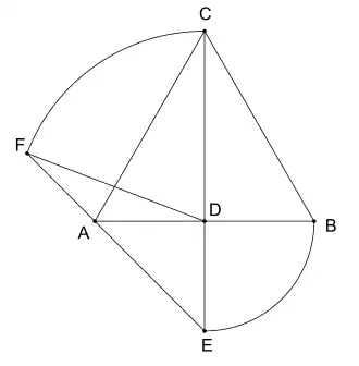 - Gegeben ist ein gleichseitiges Dreieck ABC mit der Höhe von C auf AB. Sei D der Fußpunkt der Höhe. Nun verlängert man die Höhe über D hinaus um die Länge der Strecke BD. Sei E der Endpunkt der Verlängerung. Nun verbindet man die Punkte E und A und verlängert diese Strecke über A hinaus so, dass sie den Kreis um D mit dem Radius |CD| in F schneidet. Nun teilt A die Strecke EF im Goldenen Schnitt.[3]