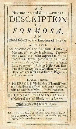 - ↑ a b Georg Stauth: Contextualizing a Vision: Psalmanaazaar, Formosa and Anthropology. In: Asian Journal of Social Science. Band 26, Nr. 2, 1998, ISSN 1568-4849, S. 85–101, doi:10.1163/030382498X00175 (brill.com [abgerufen am 24. September 2023]).