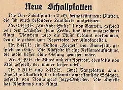 - Vox 8513 E (mx. 1818.1 BB) Slow Fox-Trot (G. Boulanger, arr. H. Biek) Konzert-Jazz-Orchester Boulanger.[10]