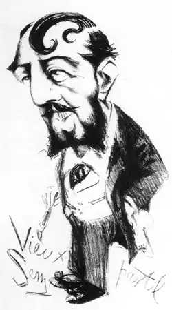 Portrait-charge von Ulrich de Vieil-Castel als Beispiel für eine frühe Zeichnung. Sem gab schnell diesen damals weit verbreiteten Stil mit den grotesk großen Köpfen auf.[1]