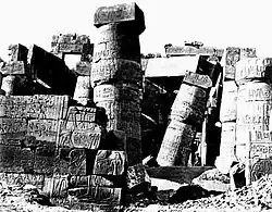 Am 3. Oktober 1899 stürzten in einer Kettenreaktion 11 der über 20 m hohen Säulen des Nordflügels der Hypostylhalle ein. Die alten Fundamente bestanden aus kleinen Sandsteinblöcken, von den Ägyptologen „talatat“ genannt, die nun dem riesigen Gewicht der 134 Säulen mit dem Dach nicht mehr standgehalten hatten. Der Sandstein war durch Erosion und salzhaltigem Grundwasser so angegriffen, dass Legrain nunmehr für jede Säule ein neues Fundament aus neuen Steinen mit Verstärkungen durch Eisen bauen musste. Die Beendigung dieser Arbeit für die 11 Säulen gibt er mit dem 15. Mai 1902 in den „Annalen“ an.[3] Auch im Südflügel wurde später das Fundament Säule für Säule erneuert, während die Säule stehen blieb.