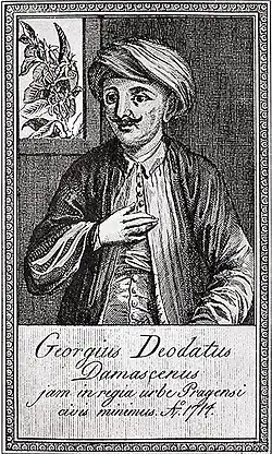 Georgius Deodatus wurde in der Mitte des 17. Jahrhunderts als Sohn christlicher Armenier in Damaskus geboren. Seine Jugend verbrachte er mit seinem Vater, einem wohlhabenden Kaufmann, in Nordafrika (Kairo und Tripolis). Er erlernte die italienische Sprache und reiste 1699 nach Rom, wo er zum Katholizismus konvertierte. Inspiriert von Ignatius Peter, dem Patriarchen von Antiochien, den er in seiner Jugend kennengelernt hatte, wollte er Missionar werden. Nach Ignatius‘ Tod, gab er jedoch diesen Plan auf und blieb vier Jahre in Rom, bevor er beschloss, weiter durch Europa zu reisen. Im Jahr 1704 begegnete er in Wien einem Landsmann, der ihn zu riskanten Handelsgeschäften überredete. Deodatus wurde von diesem Freund betrogen und verlor sein gesamtes Vermögen.[1]