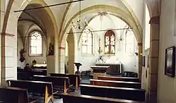 - Das große Weihwasserbecken aus schwarzem Marmor mit seitlichen Löwenköpfen stammt aus dem 17. Jahrhundert. Es gelangte nach der Säkularisation des Klosters Bethlehem hierher. Das Missionskreuz an der Wendeltreppe zur Empore datiert von 1729.