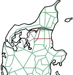 - Aalborg – mit Verbindung zur Bahnstrecke Randers–Aalborg, Bahnstrecke Frederikshavn–Aalborg, Bahnstrecke Aalborg–Hadsund und Bahnstrecke Fjerritslev–Frederikshavn