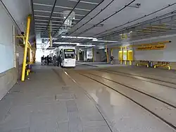 Bauarbeiten für die neue Eisenbahn-Überführung über die Straßenbahn unter dem Bahnsteigbereich -