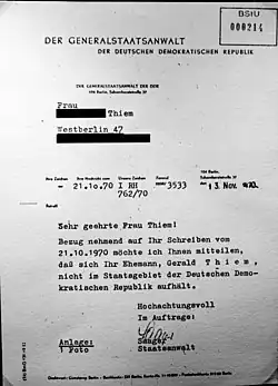 In West-Berlin verlief die Suche nach Thiem im Sande, sodass er im Juni 1981 für tot erklärt wurde. Seine Familie erfuhr 1994 durch kriminalpolizeiliche Ermittlungen in den Archiven der DDR von seinem Schicksal.