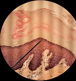 Aus der Perspektive der Chemie bedeutet die Lederherstellung eine gezielte Veränderung des Kollagenfasergerüstes, insbesondere der Dermis oder auch Corium genannt, mittels eingebrachter, die Struktur des Rohmaterials verändernder Substanzen, die zur Stabilisierung der Quervernetzungen des Kollagens führen.[2][3] In den Anfängen der Lederherstellung war es das Ziel, die tierische Haut, welche als Nebenprodukt etwa beim Erlegen von Jagdtieren anfiel, zu weiteren Produkten zu verwerten und umzuwandeln. Da das Rohmaterial Tierhaut jedoch hart und brüchig austrocknete oder durch Feuchtigkeit fäulnisgefährdet war, entwickelten Menschen im Laufe der Zeit Verfahren, die zu dem dauerhafteren Leder führten.