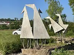 - DIE VÖGEL: 2-teilige Plastik mit einer Dreiergruppe und einer Fünfergruppe Vögel aus Faserzement, ca. 1970 Peter-Petersen (heute Johanna-Geissmar) Gymnasium in Mannheim-Schönau. Im Mai 2022 nach Nackenheim umgestellt.