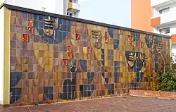 - keramisches Großmosaik, vermutlich Ende 1980er Jahre, in einem Gebäude der Zollverwaltung in Dresden (Carusufer)