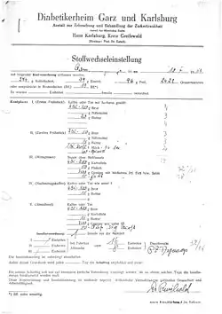 - ↑ „Dem kindlichen Diabetes, der eine gesonderte Bearbeitung trotz relativ großen Materials (über 500 Kinder wurden bisher in Garz behandelt) noch nicht gefunden hat, wird jetzt von Katsch besonderes Interesse zugewandt. Auf dem Pädiater-Kongress in Berlin 1947 wurden von ihm Hinweise zur Behandlung des kindlichen Diabetes unter besonderer Berücksichtigung der derzeitigen Ernährungsmöglichkeiten gegeben. Katsch lehnt die freie Kost Stoltes ab, welche aus pädagogischen und stoffwechselmäßigen Gründen nicht tragbar ist“, heißt es in einem unter persönlicher Beteiligung von Katsch verfassten und im April 1948 der Sowjetischen Militäradministration in Berlin vorgelegten Bericht. Abschnitt 5.6.11 Der kindliche Diabetes. Diabetesbehandlung und Diabetesforschung.Bericht über die Arbeit des Diabetiker-Heimes Garz (Rügen) von 1930 bis 1947. Von Dr.Wulf Lübken, Assistent der Medizinischen Klinik der Universität Greifswald. In: Günter Ewert, Ralf Ewert (Hrsg.): Gerhardt Katsch - Begründer des ersten deutschen Diabetikerheims und der Diabetikerfürsorge. Bericht von Wulf Lübken als Wissenschaftliche Reparationsleistung an die Sowjetische Militäradministration Deutschland (SMAD). 1. Auflage. Pro BUSINESS, Berlin 2010, ISBN 978-3-86805-665-5, S. 80–81.